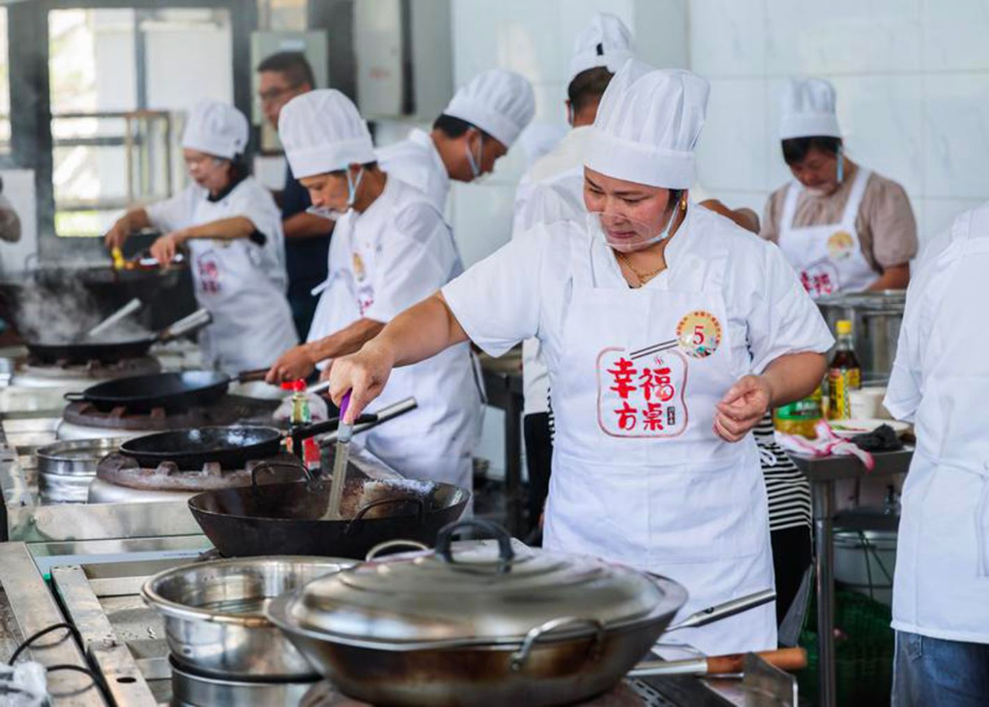 8月29日,参加“幸福方桌”厨艺大赛的乡镇老年食堂的厨师们在烹饪特色菜。当日,2024年建德市“幸福方桌”厨艺大赛拉开帷幕,来自建德16个乡镇(街道)的18家老年食堂厨师们齐聚在浙江省建德市乾潭镇幸福村文化礼堂,开展别开生面的厨艺比拼。“幸福方桌”厨艺大赛旨在通过比赛的形式,深化“幸福方桌”爱心助餐服务,提升厨师的技艺水平和服务意识,为建德老年人打造更高品质的“舌尖养老”。(新华社)