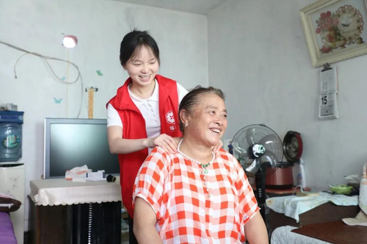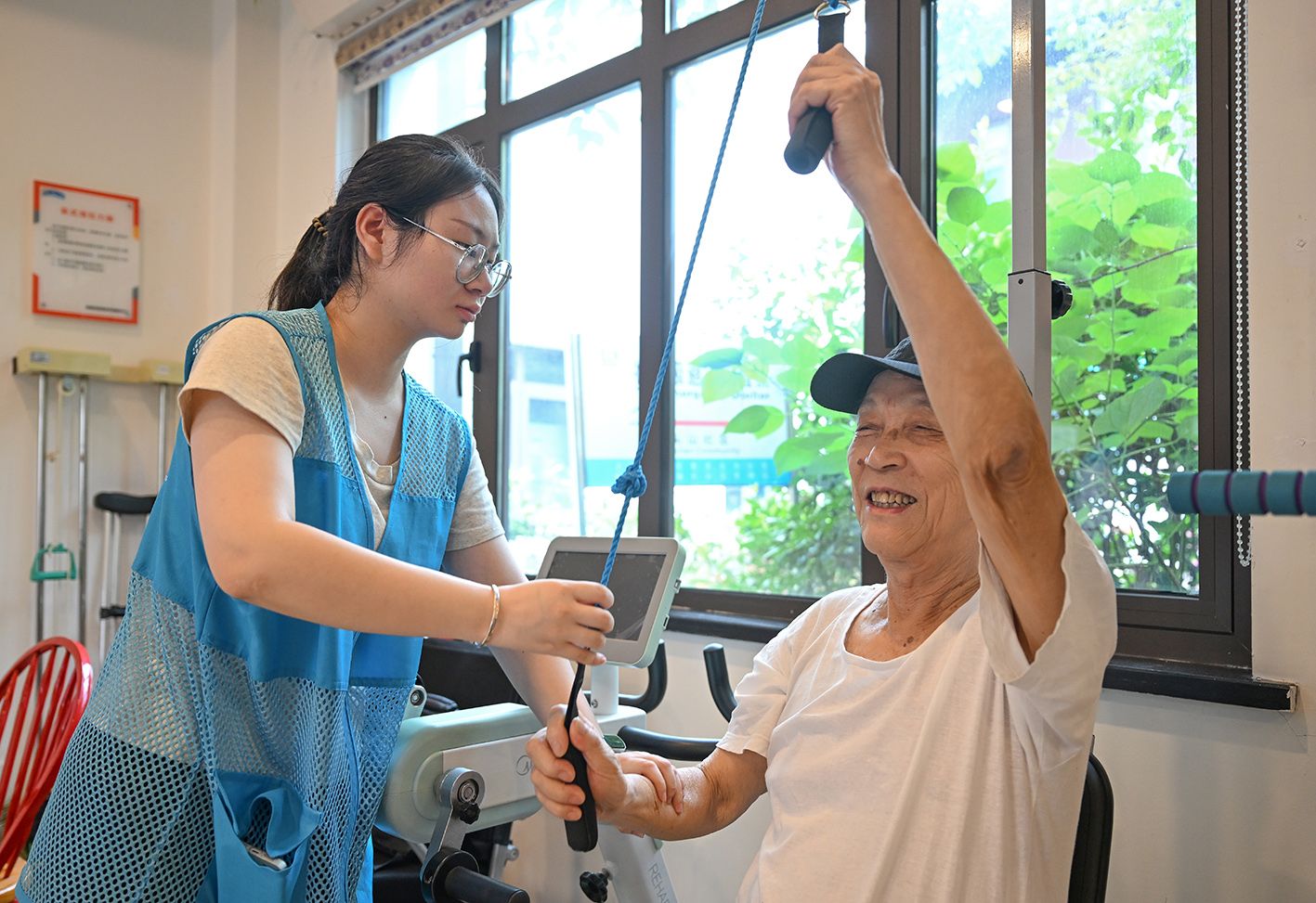 8月28日,“00后”胡玉清在养老“日托班”帮助老人做康复训练。近日,浙江杭州上城区两处“代际互助”养老点投入运营,该模式由年轻人在养老院以及养老“日托班”提供照顾陪护服务,同时以低廉的租金入住养老院,解决应届毕业生、求职者等人群的经济负担,实现双赢。(中新社)
