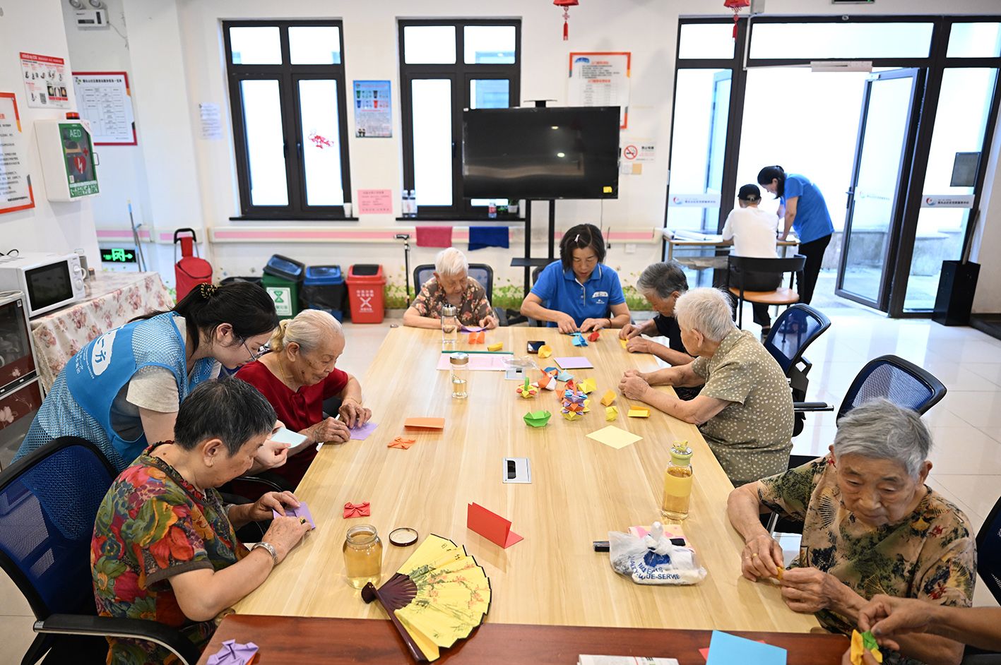 8月28日,“00后”胡玉清(蓝衣,左)在养老“日托班”指导老人进行手工制作。近日,浙江杭州上城区两处“代际互助”养老点投入运营。(中新社)