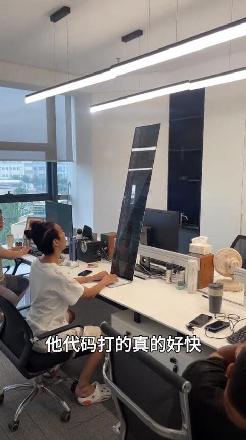 然而这还不是极限,过了几天老哥又爆改出一台屏幕更长的电脑,同事看了都夸“代码打的好快”“艺术成分很高”。