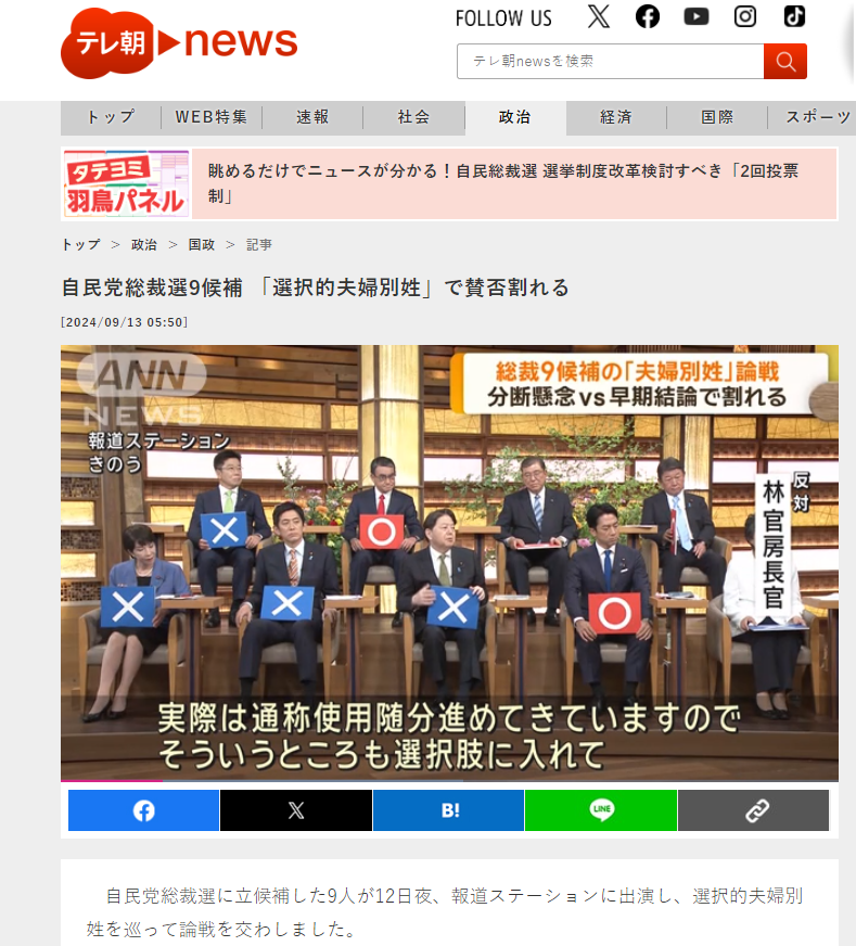 12日晚,参加自民党总裁选举的9名候选人在朝日电视台的节目中围绕夫妻别姓(夫妻不同姓)选择权的问题展开辩论。