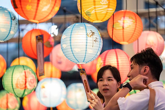 在香港元朗大桥街市,形式各异的灯笼吸引不少了游客前往打卡、购买。有商户表示,每年中秋节前后都有很多人专程到这里买灯笼,今年推出了南瓜车、宠物狗等新款式灯笼,颇受游客欢迎。