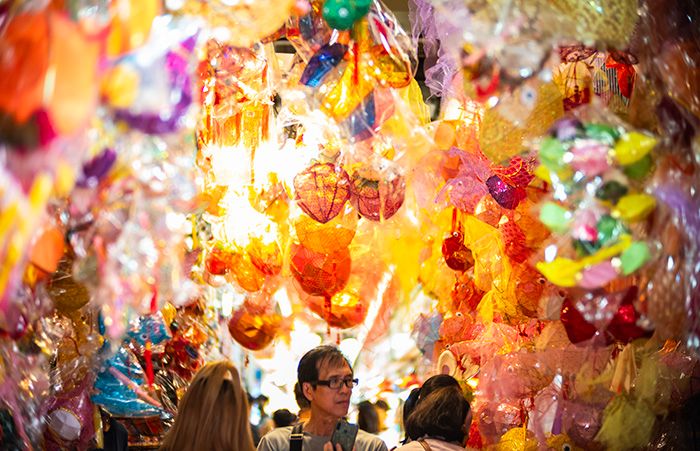 15日,元朗大桥街市“灯笼街”售卖五彩斑斓的各式灯笼,吸引市民游客前来欣赏购买。(图/中新社)