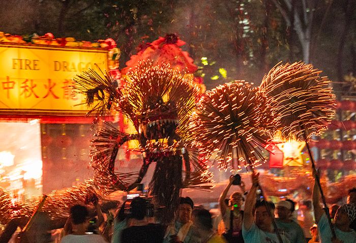 中秋月圆夜,一条“龙”浑身插满点燃的香,震天响的锣鼓声中,由数十位舞龙手奋力舞动。“火龙”盘旋腾飞,通身火光点点,在暗夜中尽情翻腾。在大“火龙”的身边,由百多名小朋友合力舞动的小“火龙”亦随之起舞。大小火龙“双龙出海”,把节日气氛推向高潮。