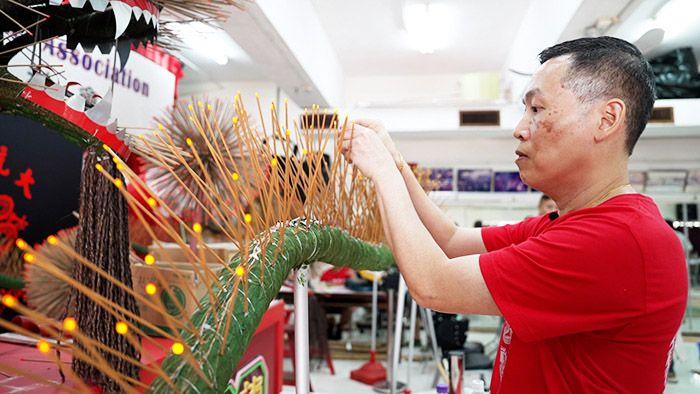 舞龙是个累活,扎作也并不轻松。陈伟成介绍,“火龙”的“龙头”和“龙尾”要用藤枝塑形成骨架;“龙身”长67米,要以粗绳缆打造;整条龙还会再加一层厚厚的珍珠草包裹。仅“火龙”的一个“龙头”就有48公斤重,整条“火龙”的重量更超过100公斤,全程需要300多人参与。“所以每年我们都要从五六月份开始提前筹备材料,再由十七八个人花费两三周的时间最终扎作完成。”