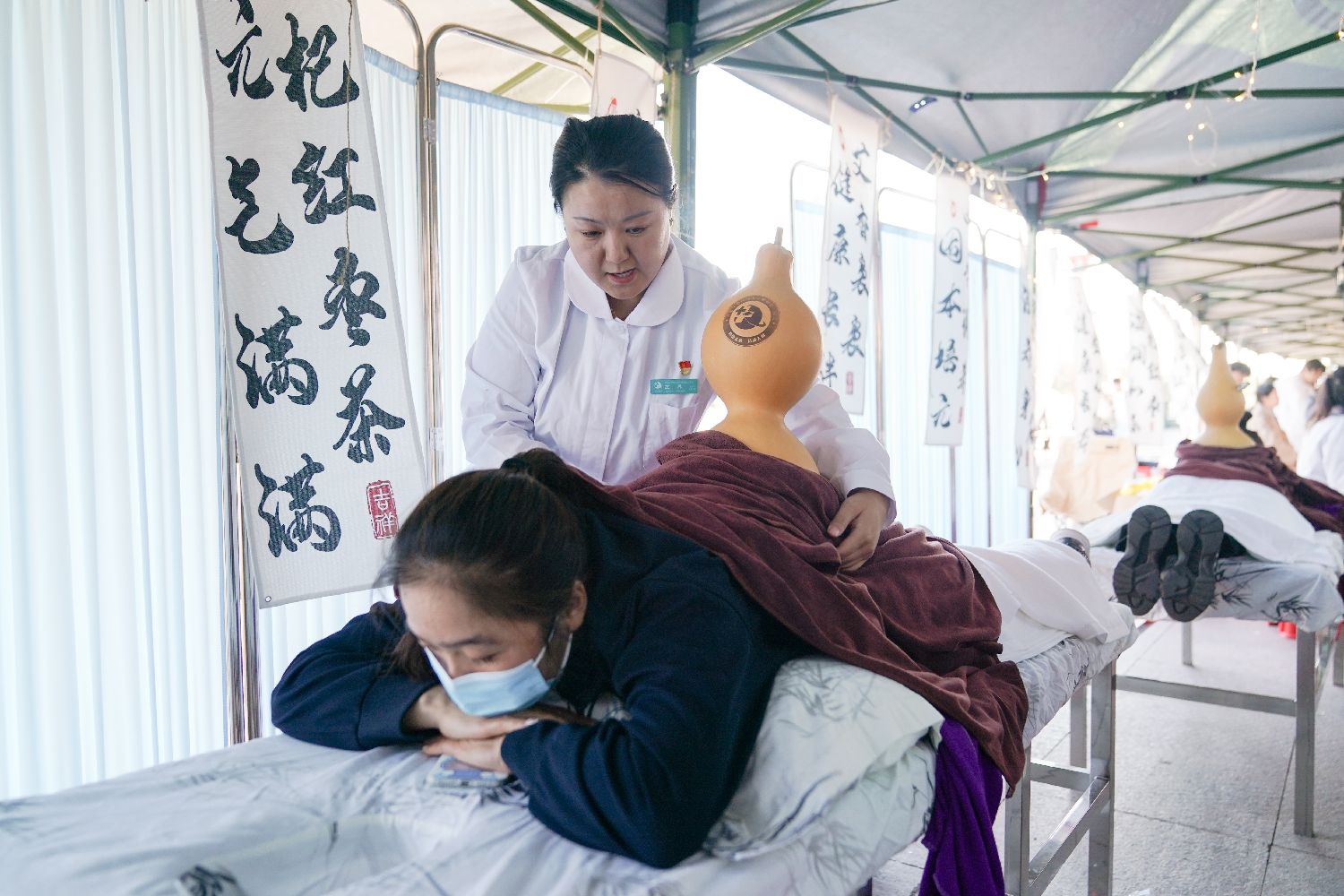 在黑龙江哈尔滨平房区红旗茂商城南广场的寒地龙医中医药文化市集上,市民们排起长队前来问诊咨询。该市集将传统文化与现代生活气息相融,设置了义诊专区、中医药文化体验区等多个展区,让市民们能更好地感受中医药文化。图为市民进行葫芦灸。(中新社)
