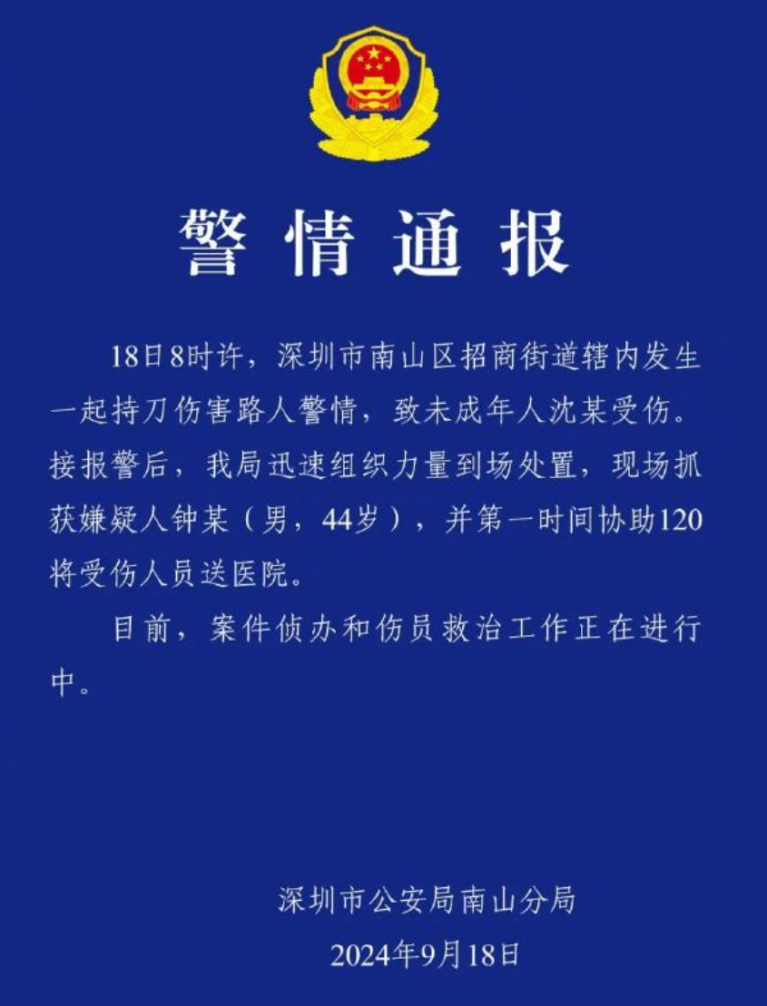 2024年9月18日早间,深圳日本人学校的一名10岁学童在上学路上遭遇另一名44岁中国男子袭击,经抢救无效,于次日凌晨在医院身亡。该消息得到了日本国驻华大使馆的确认。