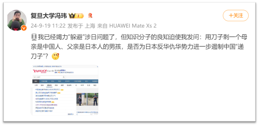 精通中日关系的复旦大学历史学系教授冯玮在微博平台评论称,类似行为无疑是给日本反华仇华势力递刀子。如他所言,今天是日本主张各种意义上的对华“脱钩”论者最得意的日子。他们在社交平台上假借对遇害男童的同情,大肆发表“撤离中国”的主张,这些言论得到了数量可观的转发。