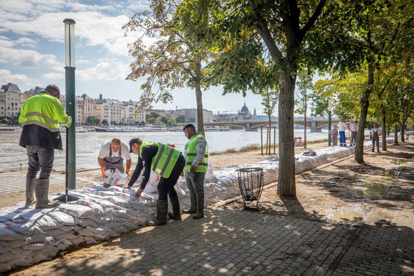 9月17日,在匈牙利布达佩斯,工作人员在多瑙河上的玛格丽特岛河岸筑起沙袋墙,预防洪水侵袭。连日降雨导致多瑙河水位持续上涨。在匈牙利,多瑙河“10年来最大的洪水”正在逼近首都布达佩斯,该市洪水警报升至最高等级三级。(新华社)