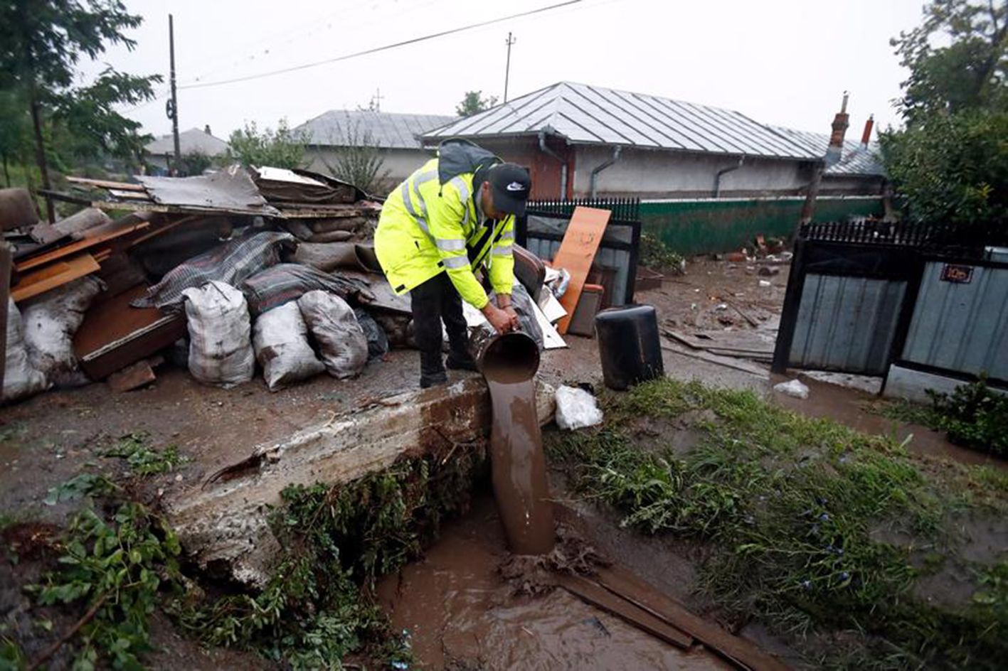 9月15日,在罗马尼亚加拉茨县斯洛博齐亚科纳基,一名男子清理家中的积水。罗马尼亚东部近日遭遇强降雨,多地遭受洪水侵袭。(新华社)