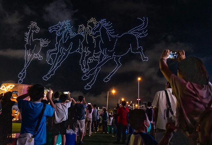 20时整,随着无人机螺旋桨划破空气的“嗡嗡”声,一排排色彩斑斓的无人机有序升空。在现场观众阵阵惊呼声里,无人机到达预定高度。