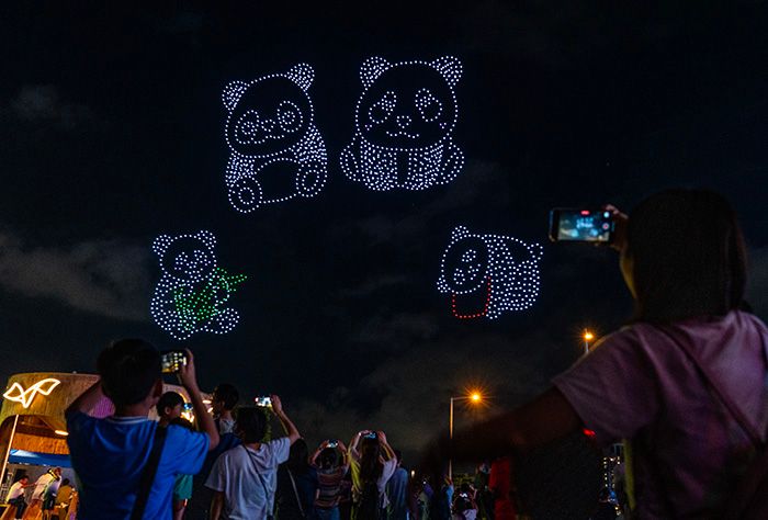 图为表现第三对中央赠港大熊猫和香港海洋公园新诞生的熊猫幼崽的无人机展示。 (图/中新社)