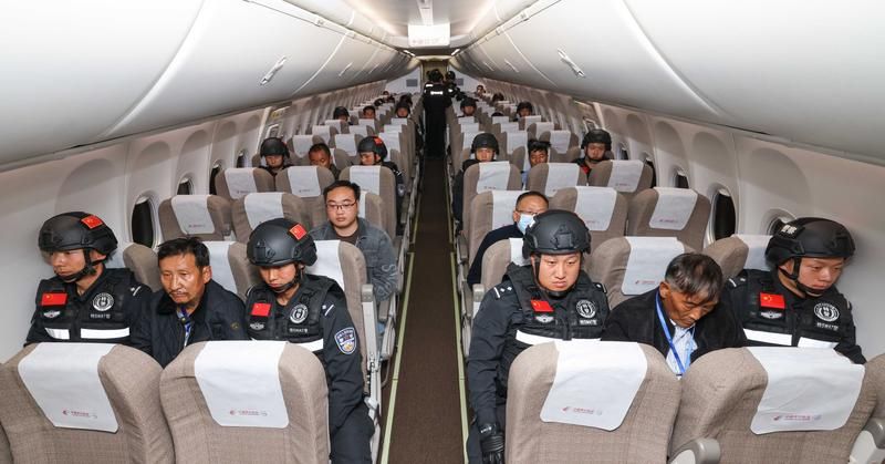 2024年1月30日,白所成、白应苍、魏怀仁、刘正祥、刘正茂、徐老发等10名缅北重大犯罪嫌疑人在被押解回中国的飞机上。(图/新华社)