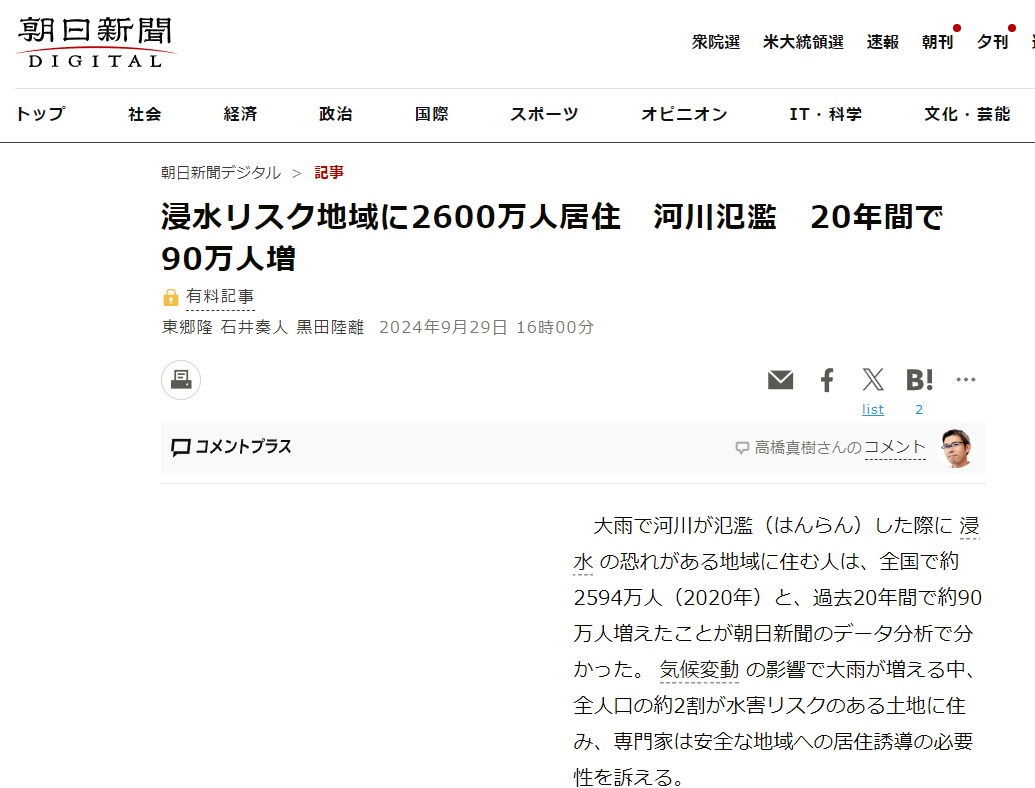 在因大雨导致河流泛滥时,生活在面临被洪水淹没风险地区的人口约有2594万,在过去20年间增加了约90万人。(图/《朝日新闻》报道截图)