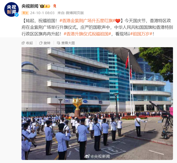 今天国庆节,中国香港特区政府在金紫荆广场举行升旗仪式。庄严的国歌声中,中华人民共和国国旗和香港特别行政区区旗冉冉升起!香港升旗仪式祝福祖国,看现场↓祖国万岁!
