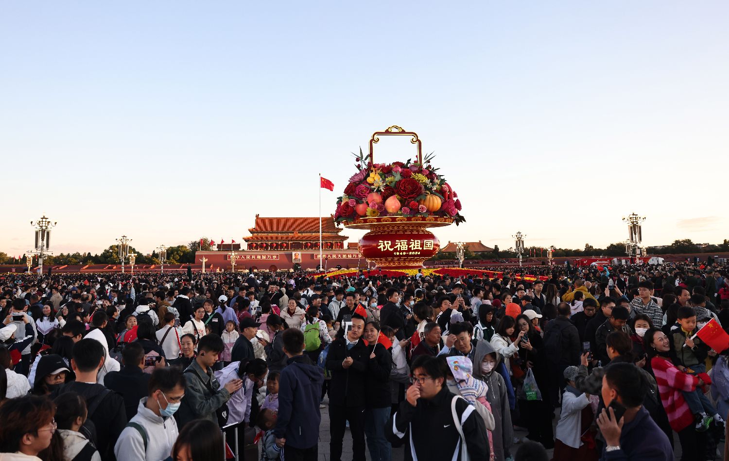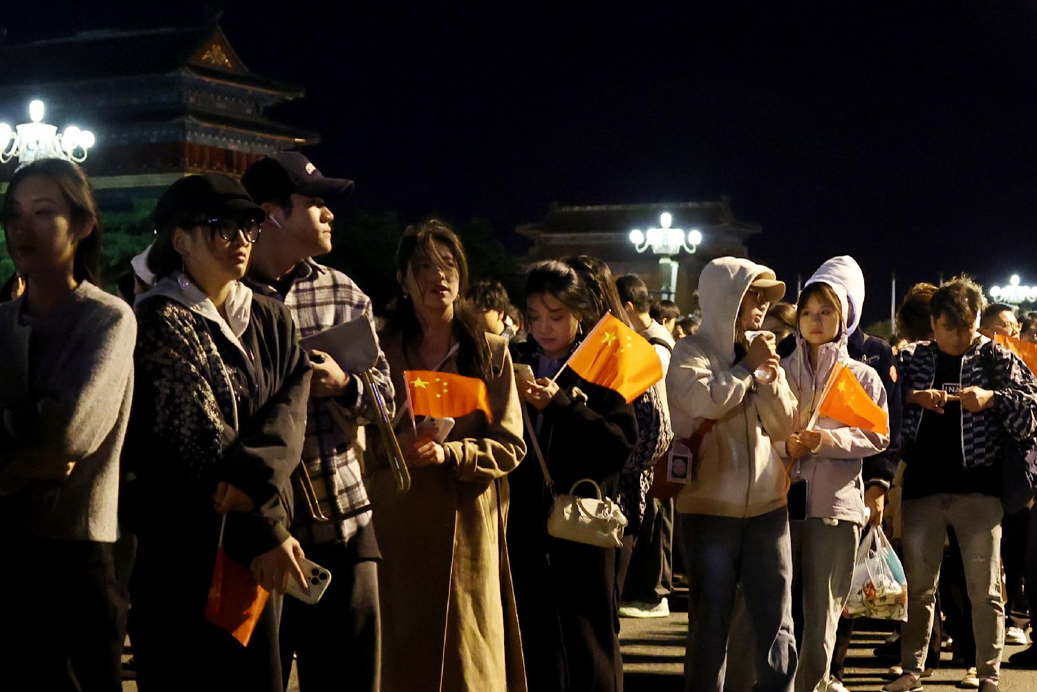 2024年10月1日,游客在北京天安门广场等候观看升旗仪式。(卞亚文/图)
