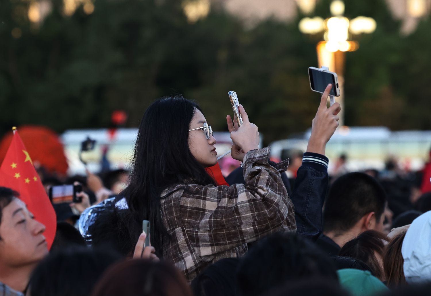 2024年10月1日,游客在北京天安门广场观看升旗仪式。北京时间10月1日早晨6时许,迎着清晨第一缕阳光,北京天安门广场举行新中国成立75周年国庆节升旗仪式,12.3万名来自海内外游客齐聚天安门广场,共同见证五星红旗冉冉升起。 (卞亚文/图)