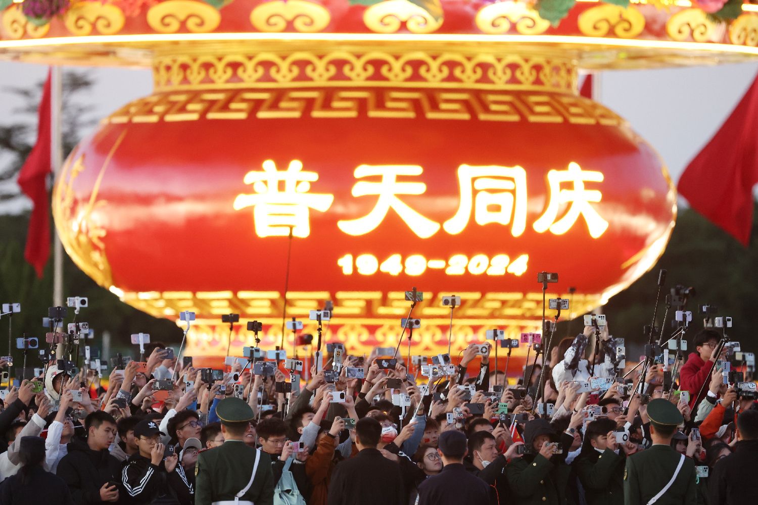 图为10月1日,北京天安门广场前升国旗仪式现场市民拍照。(中新社)