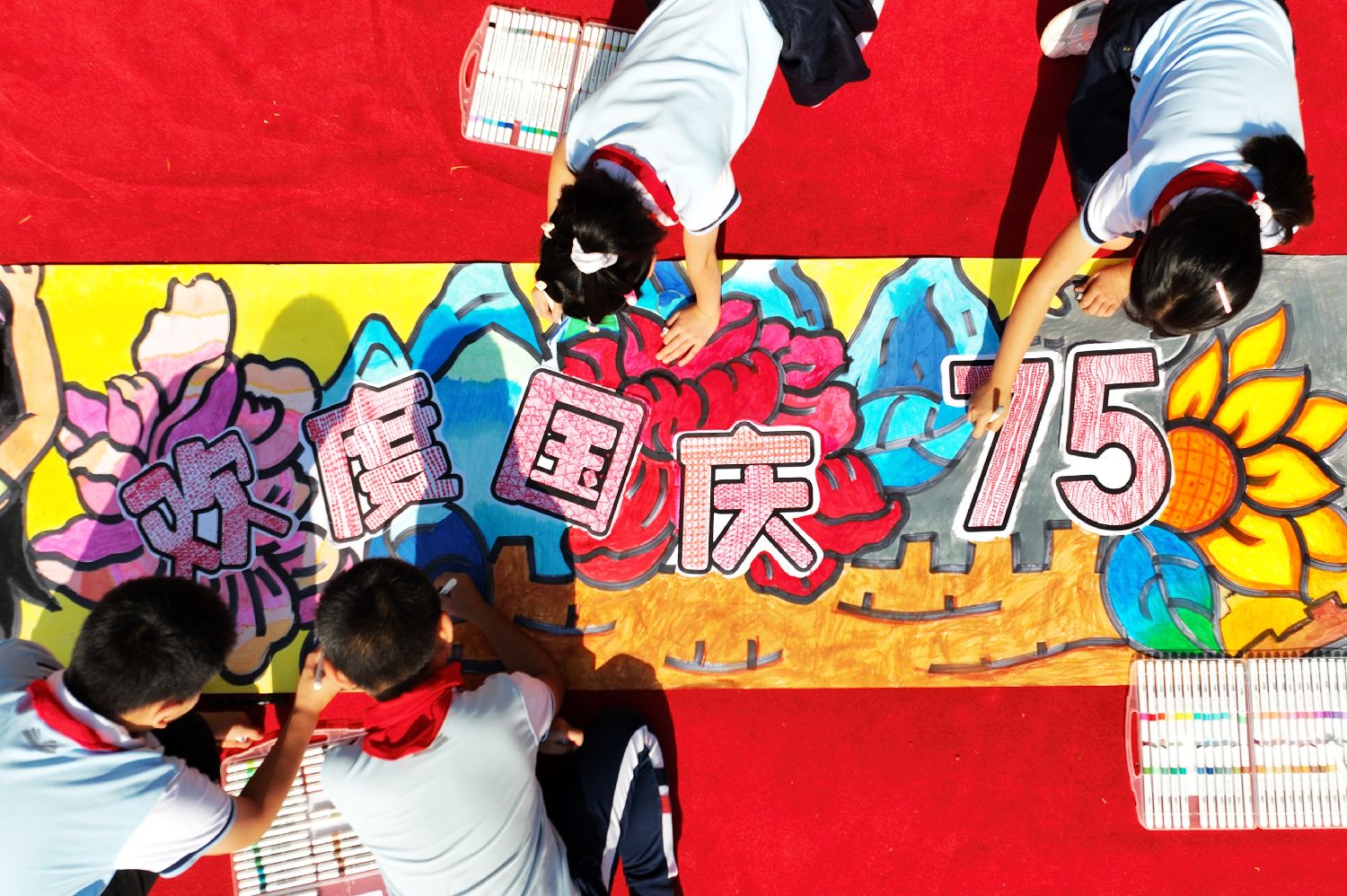 图为9月28日,在山东青岛重庆路第三小学,孩子们共绘迎佳节彩色画卷(无人机照片)。(新华社)