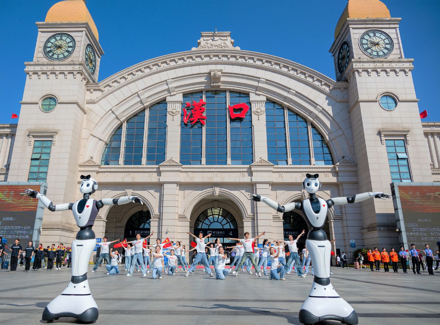图为9月29日,中国铁路武汉局集团有限公司在汉口火车站广场开展迎国庆快闪活动。(新华社)