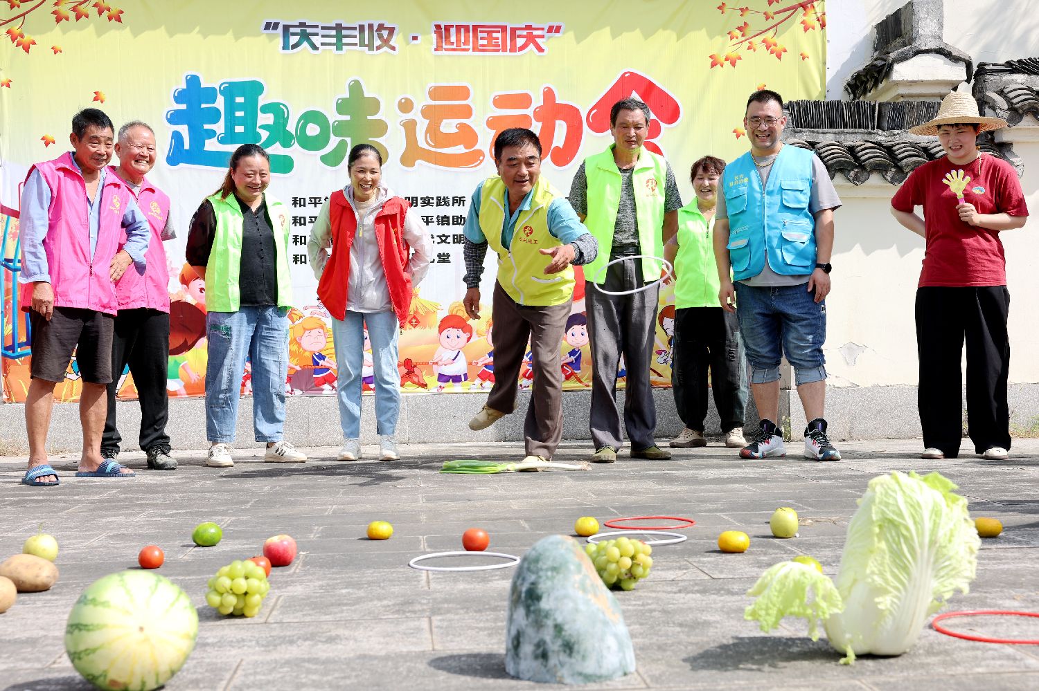 图为9月29日,在浙江省湖州市长兴县和平镇横山村,村民在“庆丰收·迎国庆”趣味运动会上进行蔬果套圈比赛。(新华社)