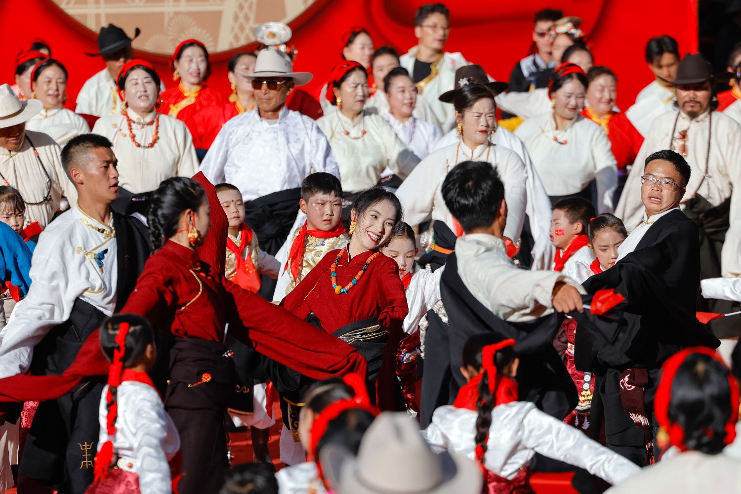 图为9月29日,四川省甘孜藏族自治州道孚县举办“花开道孚庆华诞·同心共筑中国梦”庆祝中华人民共和国成立75周年活动,在道孚县音乐广场,人们身着节日盛装跳锅庄舞。(新华社)