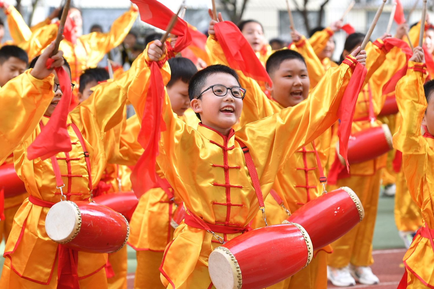 图为9月29日,在山东青岛重庆路第三小学开展的迎国庆主题展演活动上,孩子们进行腰鼓表演。(新华社)