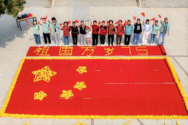 图为近日山西省高平市朴村,当地农民把刚收获的玉米摆成国旗的图案,表达丰收的喜悦,迎接国庆佳节的到来。(太原《黄河新闻网》)
