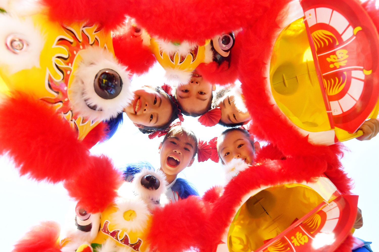 图为9月27日,在山东青岛北仲路第一小学开展的国庆主题系列活动上,小学生在表演狮子舞。(新华社)