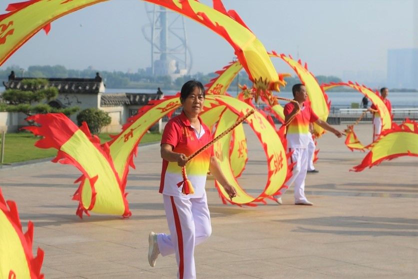 图为9月29日,在山东临沂隧道广场,临沂琅琊龙凤鞭开展花鞭舞龙迎国庆活动,一条条红色长龙彩带在表演者的手中飘扬翻飞,营造出喜庆的国庆氛围。(济南《中国山东网》)