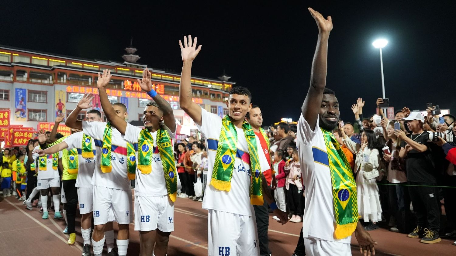 当地时间10月3日晚,在中国贵州省榕江县“村超”球场,来自“足球王国”巴西圣保罗高桥足球队的球员在现场观众的欢呼中,切身感受到中国乡村足球的快乐与激情。