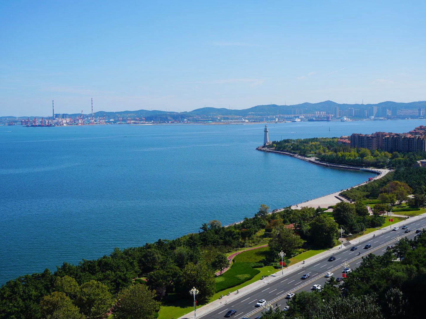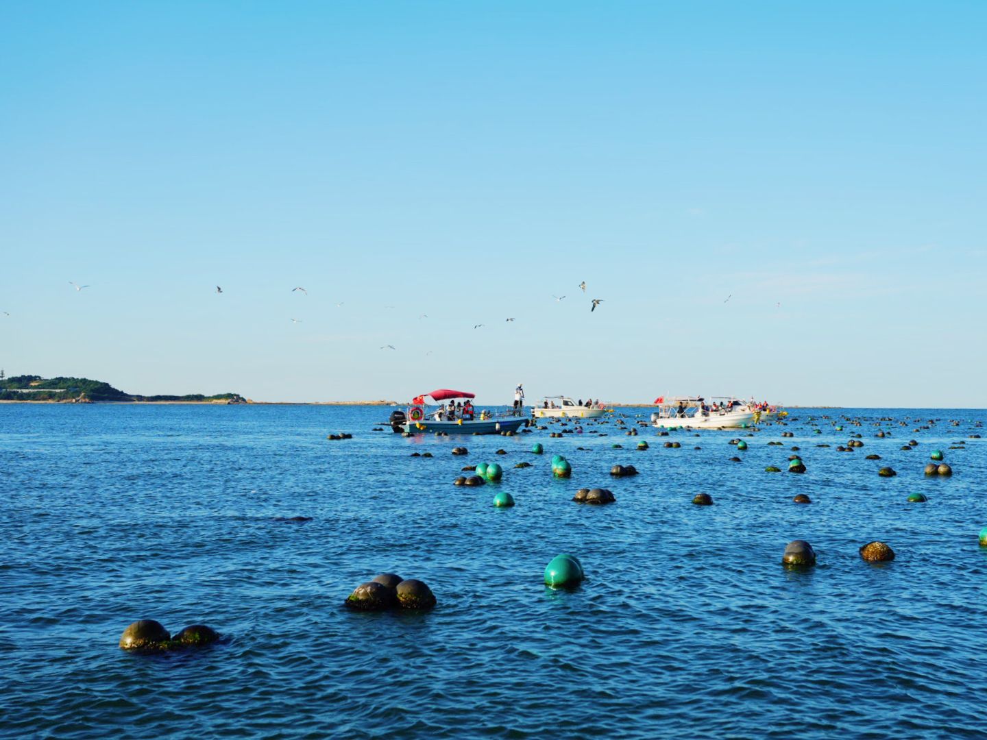 图为10月5日,蓝天白云下的威海海湾,碧海相依青山相伴,游客络绎不绝。(苏非子/摄)