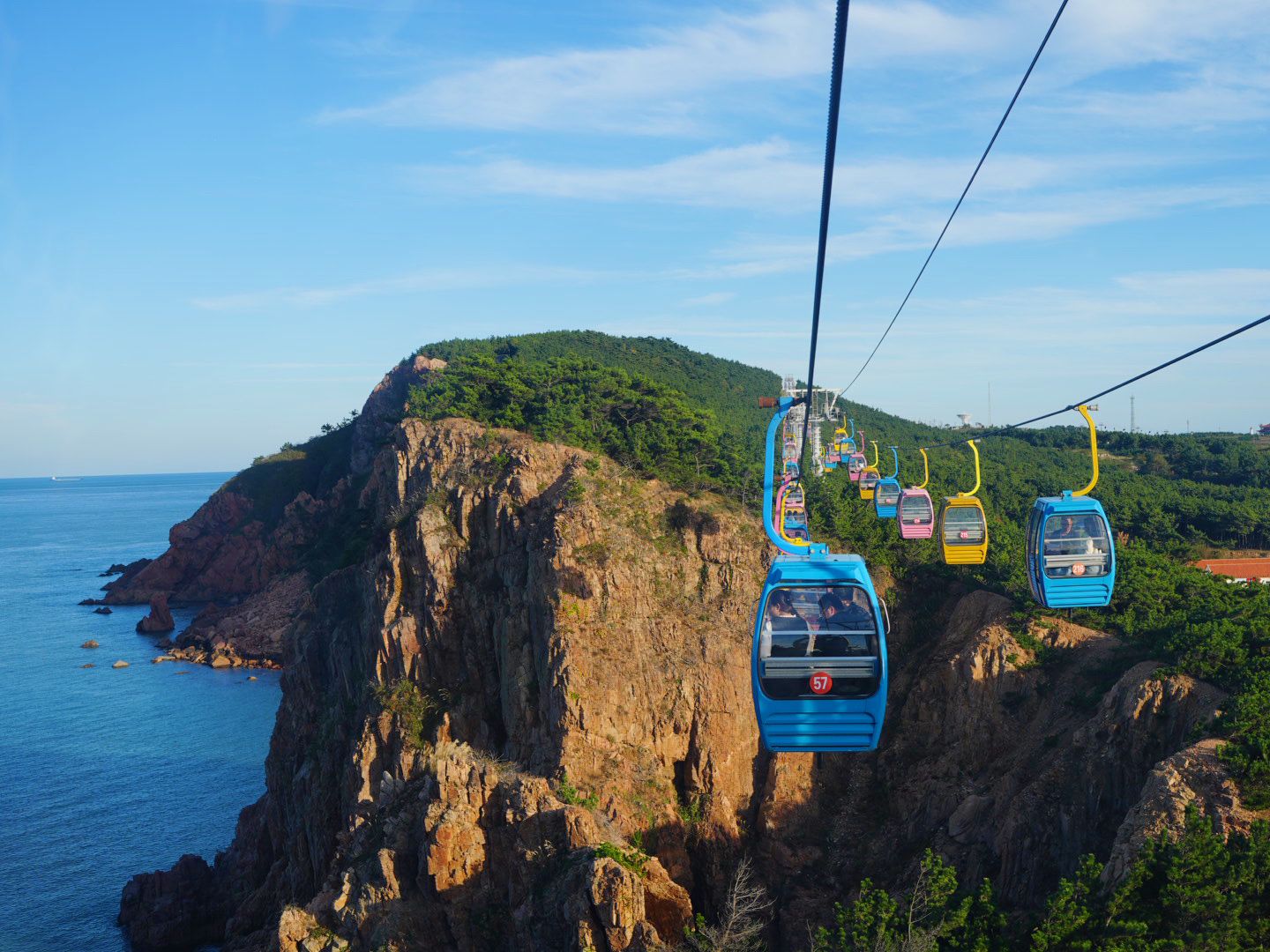 图为10月5日,游客乘摩天岭索道穿行于海边峰峦翠柏之间,凭栏观海。(苏非子/摄)