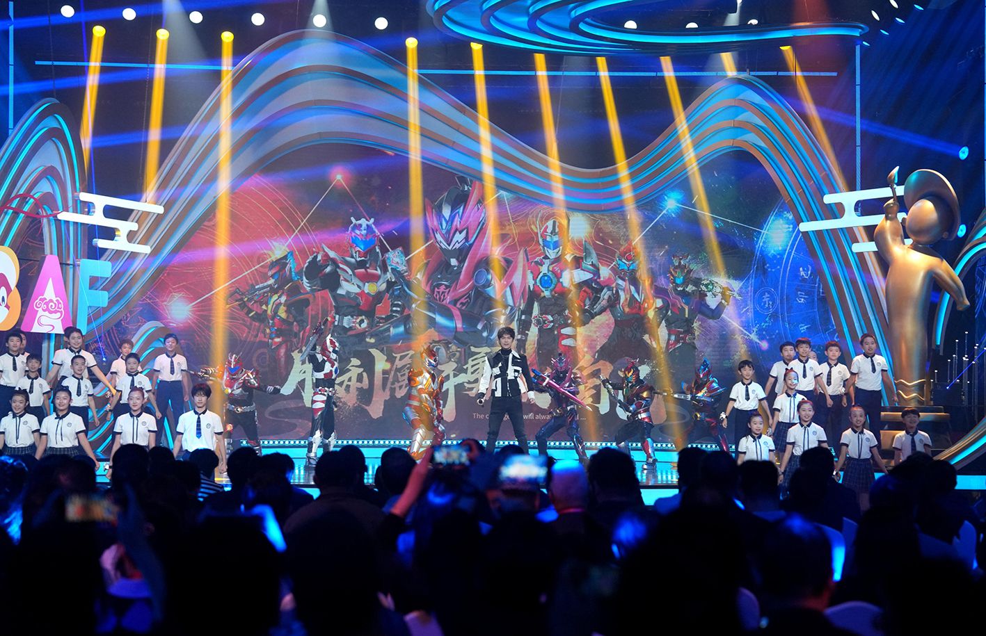10月10日,伴随着全国少儿卫视主持人共唱主题曲《奇幻彩虹》穿越奇幻光影打造的彩虹隧道,2024北京动画周“绘东方”启动仪式在北京举行。(北京日报客户端)