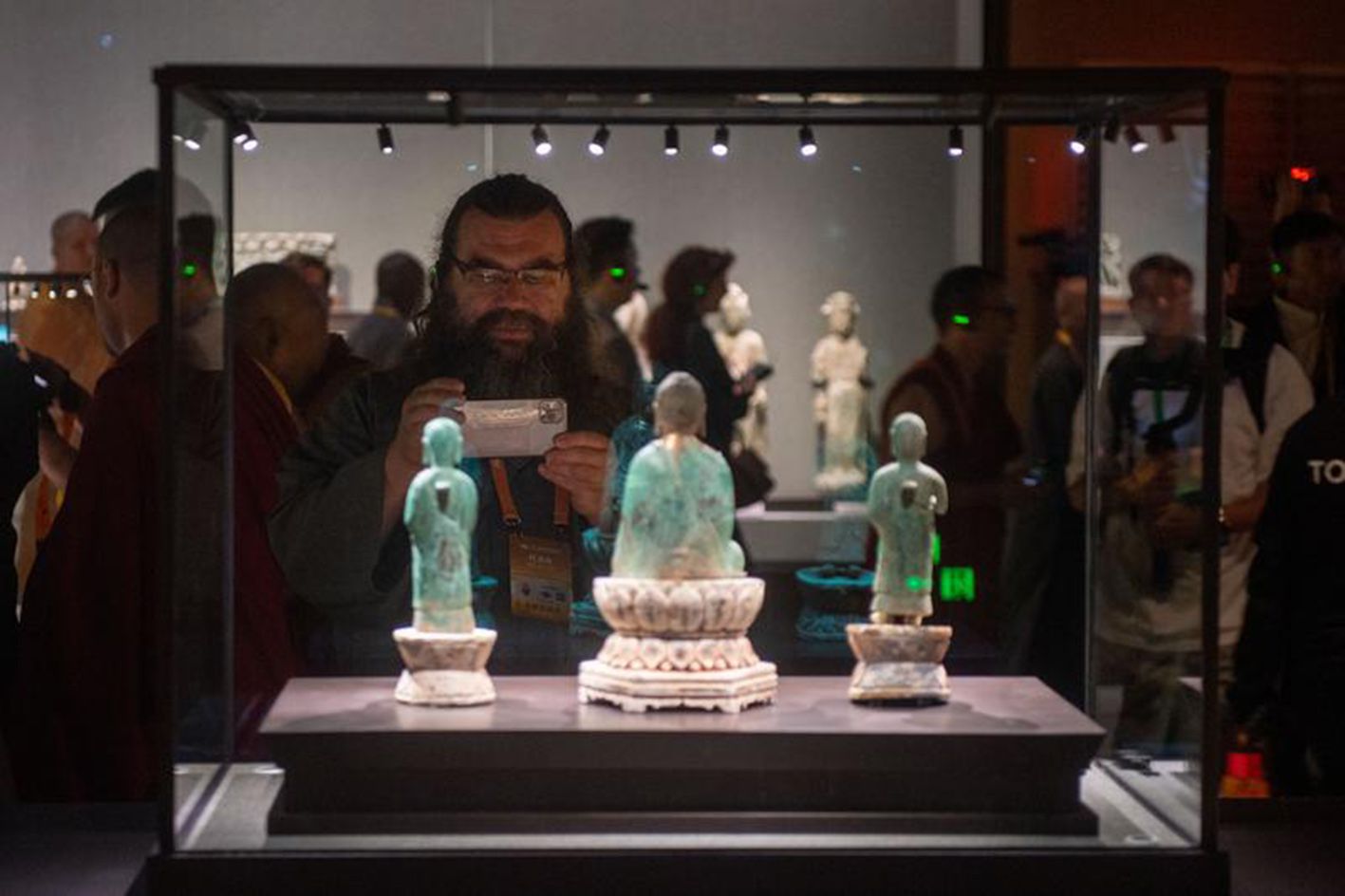 10月15日,观众观看第六届世界佛教论坛文化展陈。当日,第六届世界佛教论坛文化展陈在浙江省宁波市奉化区弥勒博物馆开展。(新华社)