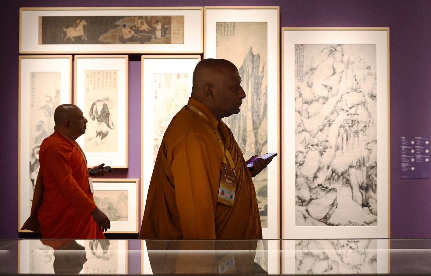 10月15日,第六届世界佛教论坛三场文化展陈在浙江宁波弥勒博物馆举行。图为与会者参观“翰墨佛缘——‘中国历代绘画大系’佛教艺术珍品展”。(中新社)