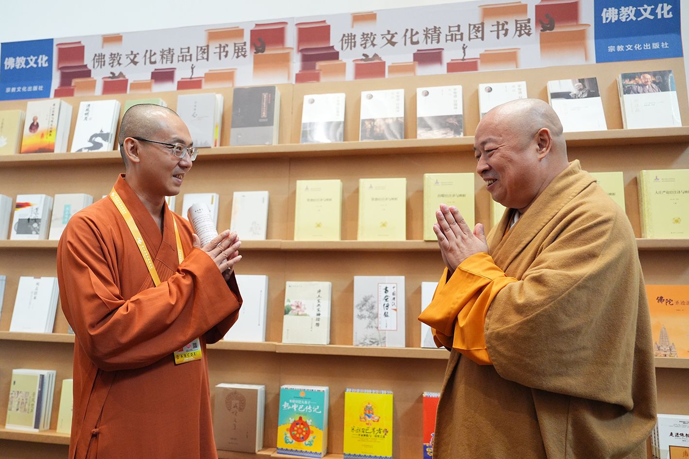 10月15日,“佛教文化精品图书展”在浙江宁波弥勒博物馆举行。据悉,此次展陈由宗教文化出版社主办,图书分为佛教经典、佛教历史、佛教文化、解经讲道、佛教艺术等八大类,共六百余种。图为参加第六届世界佛教论坛的两岸法师相互致意。(中新社)