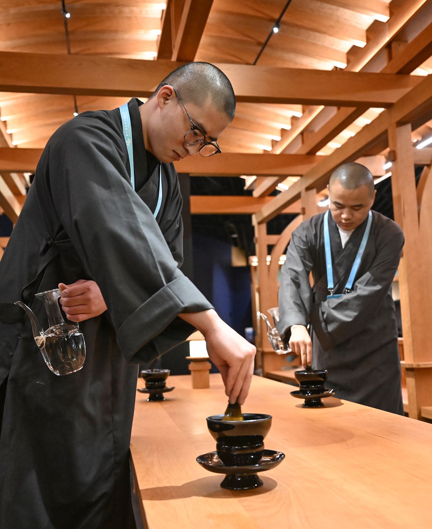 10月15日,第六届世界佛教论坛三场文化展陈在浙江宁波弥勒博物馆举行。图为与会者在“和合共生——世界佛教文化艺术展”上体验宋式点茶。(中新社)
