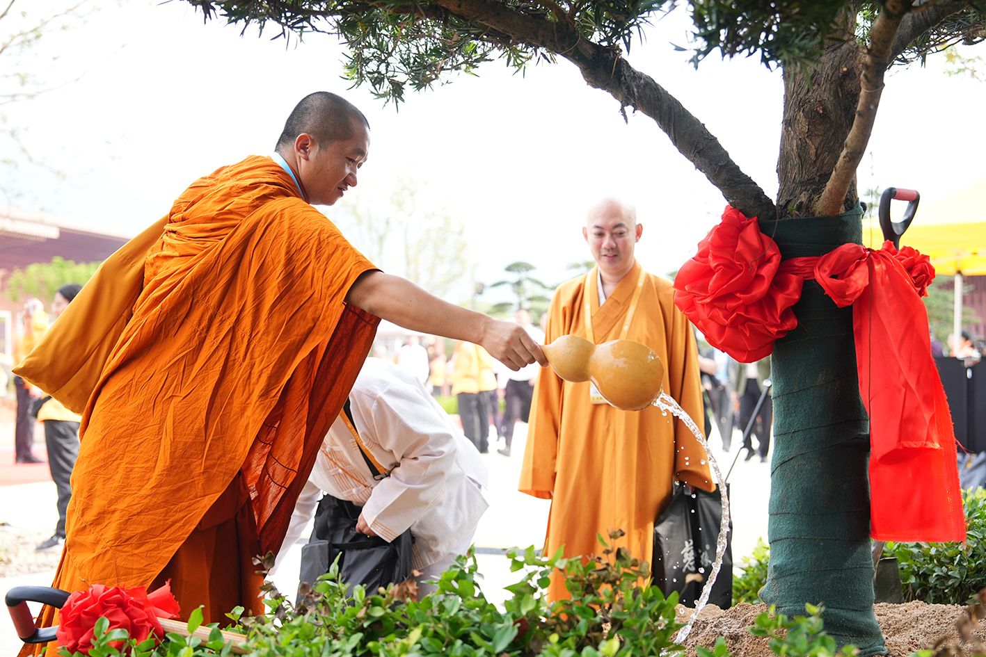 10月15日,第六届世界佛教论坛共结“欢喜缘”活动在浙江宁波弥勒圣坛和合广场举行。图为与会者为共植的树木浇水。(中新社)