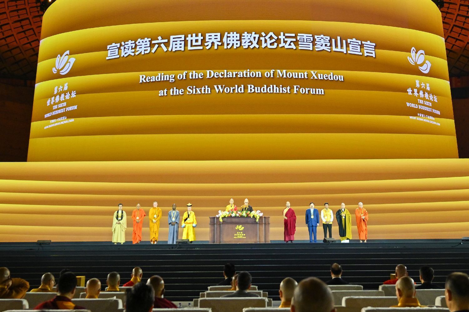 10月17日,第六届世界佛教论坛闭幕式在浙江宁波举行。图为闭幕式上宣读第六届世界佛教论坛《雪窦山宣言》。