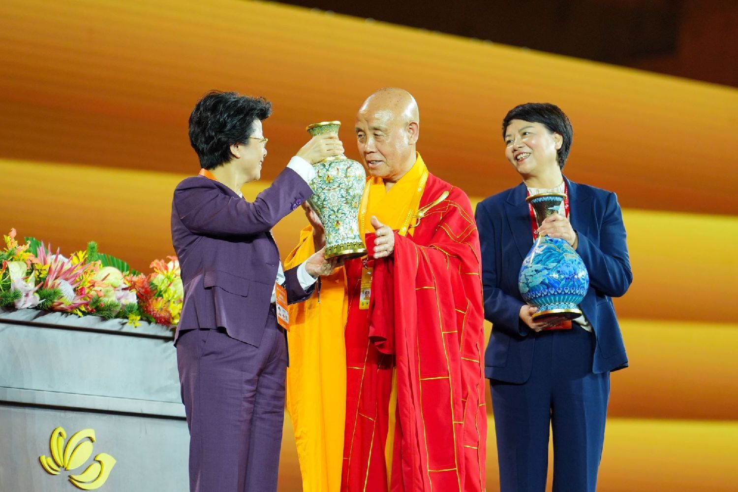 10月17日,第六届世界佛教论坛闭幕式在浙江宁波举行。图为中国佛教协会会长演觉(中)赠送纪念品。
