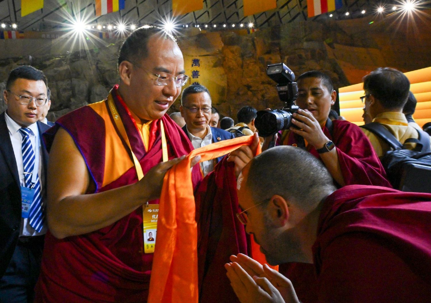 10月17日,第六届世界佛教论坛闭幕式在浙江宁波举行。图为闭幕式后,中国佛教协会副会长、第十一世班禅额尔德尼·确吉杰布为外国法师赐福。