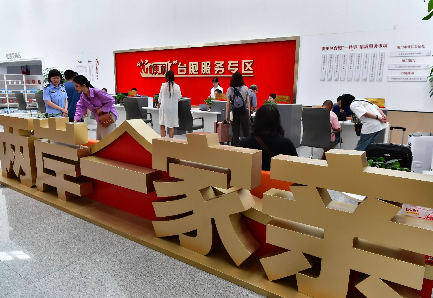 今年9月26日,台胞在厦门市赴金旅游办证中心“近便利”台胞服务专区办理有关业务。该专区今年6月揭牌,集合了公安、湖里区政务服务中心、中国移动、厦门银行、鹭江公证处等5家单位49个事项,台胞一抵达厦门就可以到这里办事。(图/中新社)
