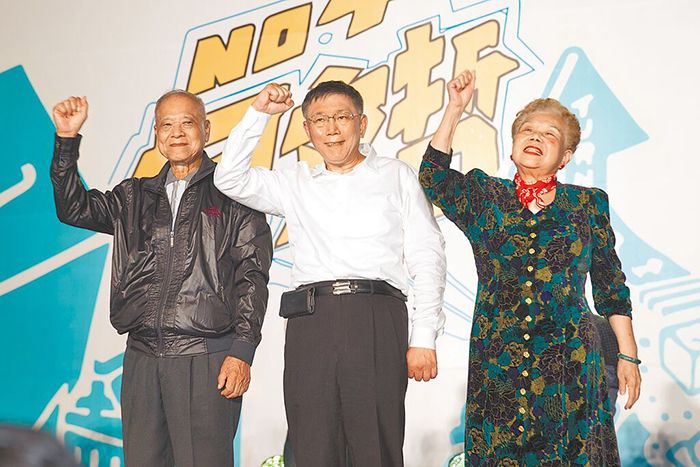 民众党20日证实,柯父病危住进加护病房,柯文哲18日已赴医院探视。图为柯文哲(中)造势活动,柯父与柯母现身力挺。(图/台北中时新闻网资料图)