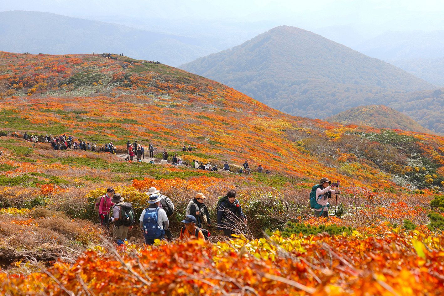 10月13日,日本宫城县,大自然爱好者在横跨宫城县、秋田县和岩手县的栗栗山山坡上散步,接近在1626米高的山上观赏秋叶的最佳时间。山腰和山顶上的许多树木都变成了鲜红和橙色,为徒步旅行者创造了一个美好的秋天氛围。据登山起点所在的栗原市宫城县介绍,由于今年夏天非常炎热,秋叶的最佳季节比往年晚了一周左右。(CFP)