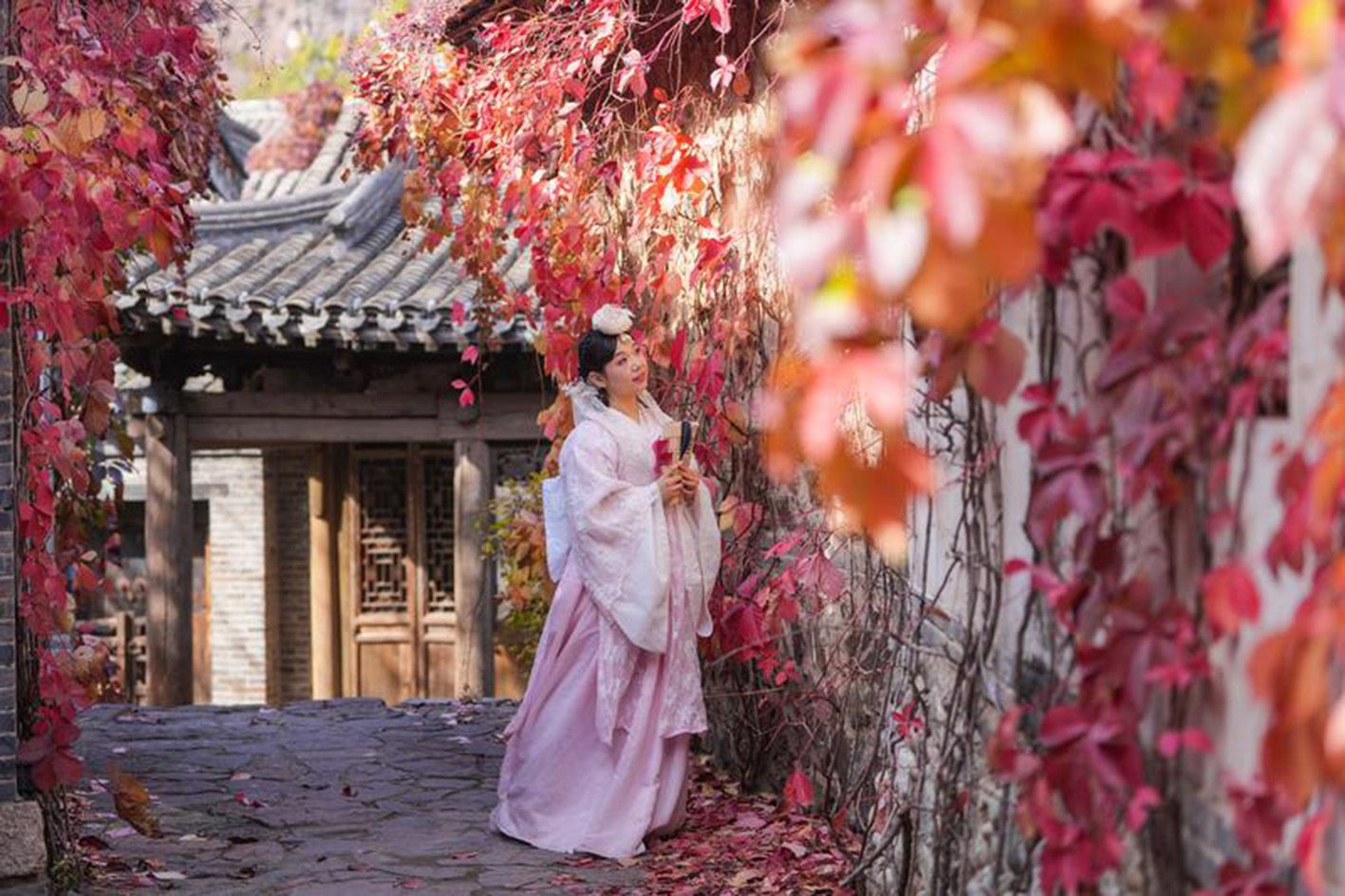 10月20日,游客在北京古北水镇拍摄写真。金秋时节,位于北京市密云区的古北水镇彩叶缤纷,吸引许多游客前来游玩赏秋。(新华社)