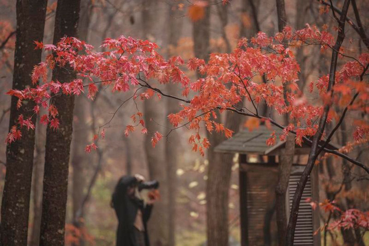 10月18日,游客在辽宁省本溪市关门山国家森林公园游览拍照。当日,不少游客来到位于辽宁省本溪市的关门山国家森林公园,在小雨中漫步山间,感受别样的秋日美景。随着气温下降,有着“枫叶之都”美誉的辽宁省本溪市枫叶观赏期临近尾声。(新华社)