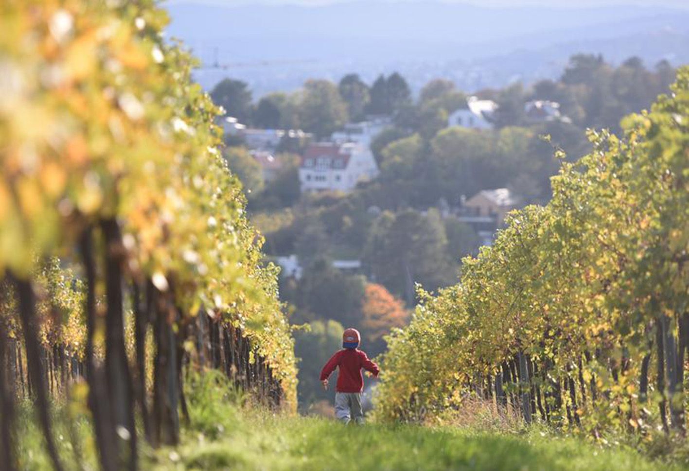 10月15日,在奥地利维也纳市郊的卡伦山上,一名儿童在葡萄园里奔跑嬉戏。秋季,奥地利首都维也纳市郊的卡伦山迎来众多游客。人们在山上赏秋观景,或徒步骑行,享受美好时光。(新华社)