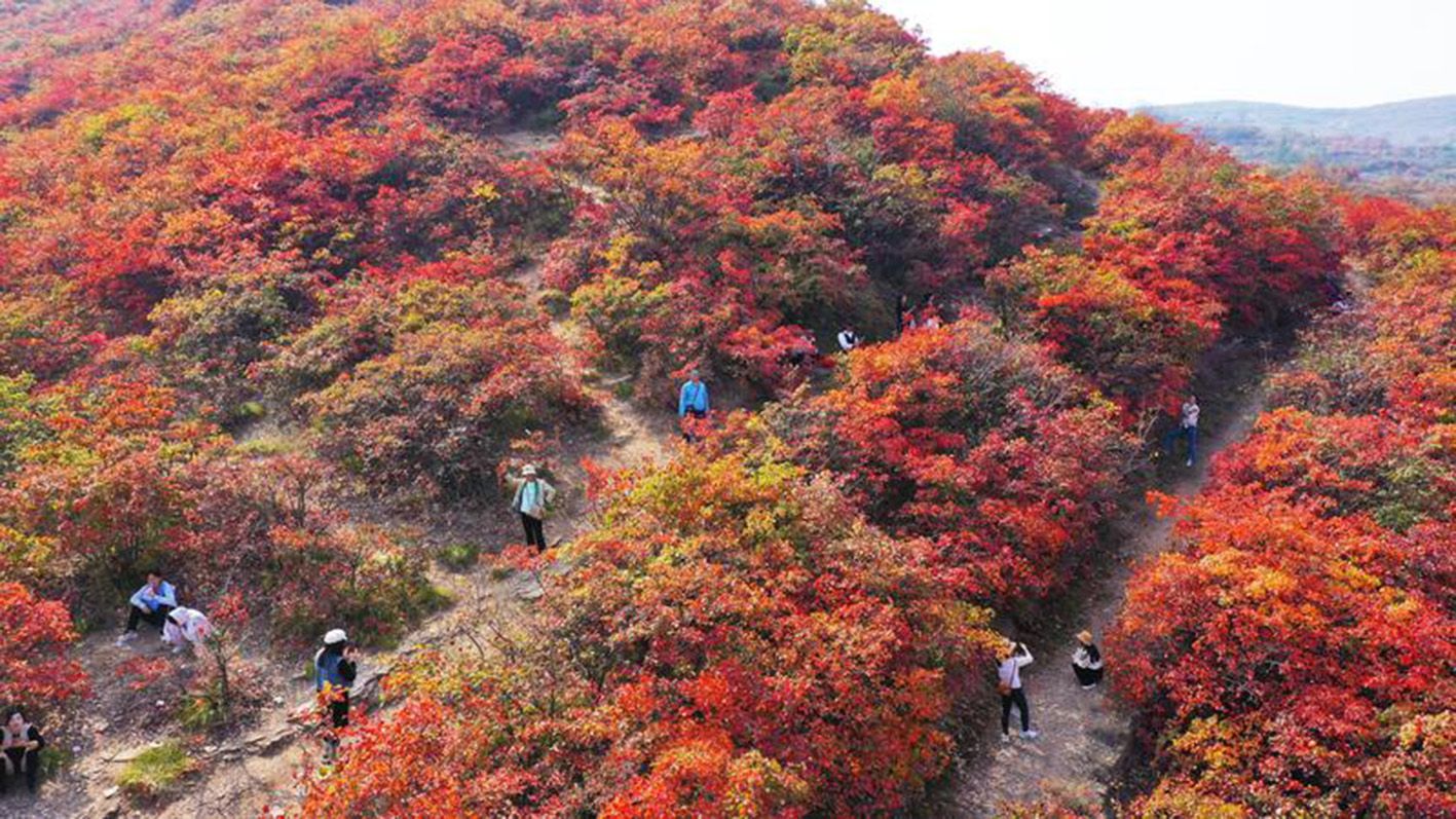 10月14日,游客在河南省禹州市鸠山镇天垌村栗子园沟欣赏秋景(无人机照片)。(新华社)