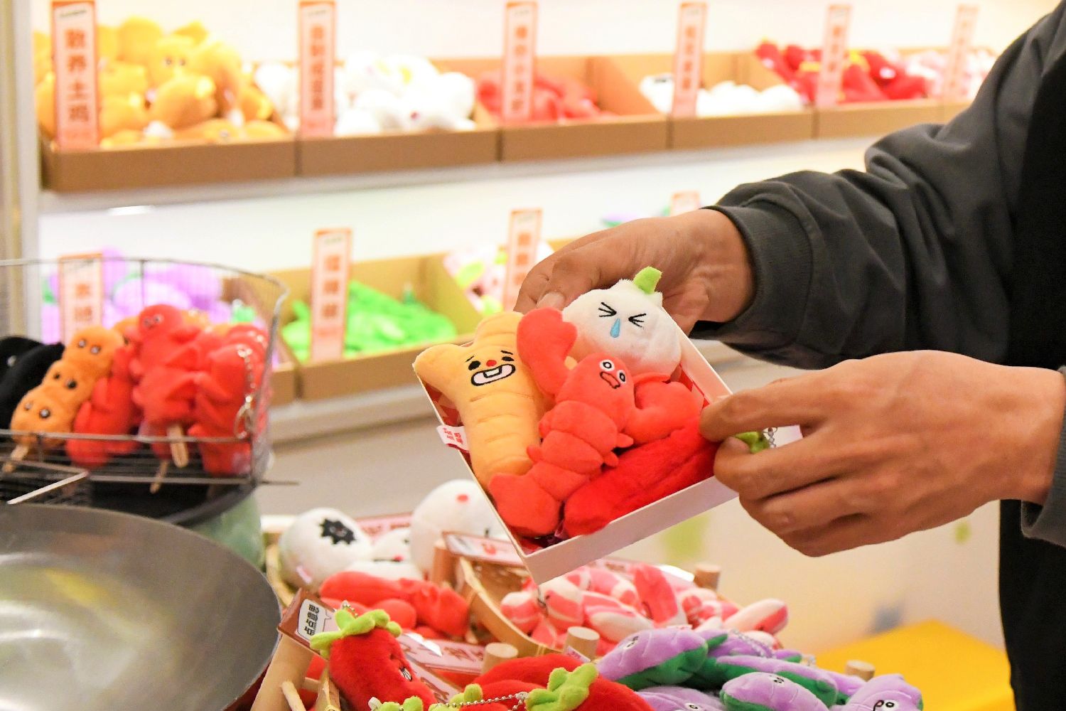 图为10月22日,长沙一玩偶店内的湘菜版毛绒玩具受到顾客热捧,店员正为顾客进行“烹饪”。(中新社)